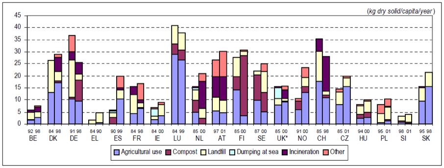 The amount of sewage sludge used in agriculture in the UK, France, Spain, Italy and Ireland increased between 1995 and 2000, but it declined in Germany, Denmark, Sweden, Finland, Austria, Portugal and Belgium. In the Netherlands and Greece, the amount of sewer sludge used in agriculture was small.